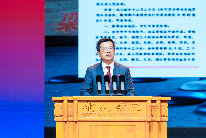 高屹代表市四套班子和253万衢州人民,向衢州学院全体师生、校友致以诚挚祝贺,向长期以来关心支持衢州建设发展的社会各界人士表示衷心感谢。他充分肯定衢州学院建校40年来取得的显著成绩和对衢州经济社会发展作出的重要贡献,并围绕“清醒地知道自己是谁”“清楚地知道自己想要什么”“清晰地知道如何实现自己的目标”三个问题,进一步明确衢州学院的发展定位、发展目标和发展路径,希望衢州学院深入贯彻落实习近平总书记关于教育的重要论述精神,按照省委建设高等教育强省部署,以全方位融入和服务衢州经济社会发展为己任,奋力走好立德树人、内涵发展、校城融合之路,加快建设高水平特色鲜明的应用型大学。